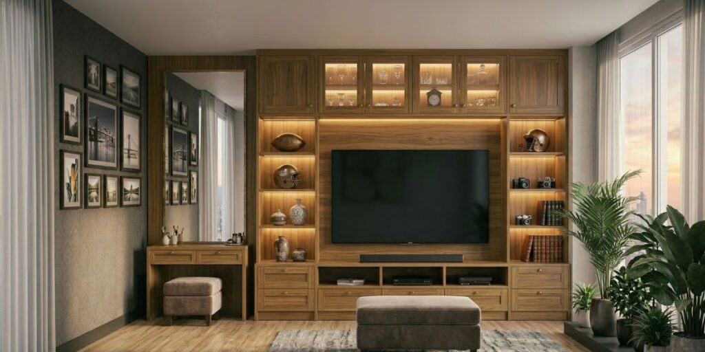 Functional units that combine storage with style for living rooms and entertainment areas.